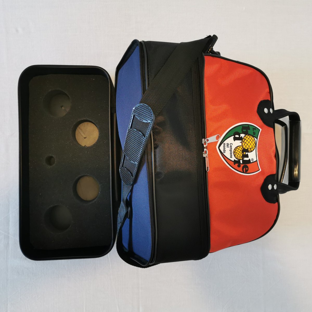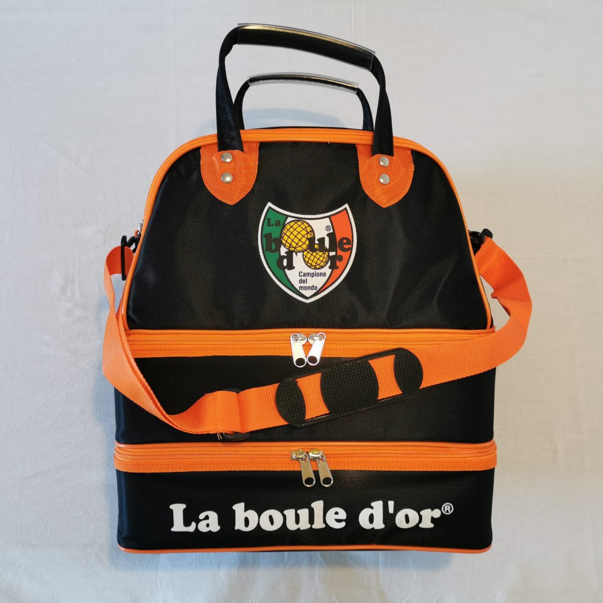 Sac double fond (4 compartiments) avec poignée renforcée, bandoulière détachable et réglable et porte-étiquette. En bas, compartiment séparé rigidifié avec mousse pouvant recevoir 4 boules + but. Les chaussures pourraient trouver leur place dans le compartiment du milieu, les vêtements dans le rangement du dessus. Poche supplémentaire sur le devant.